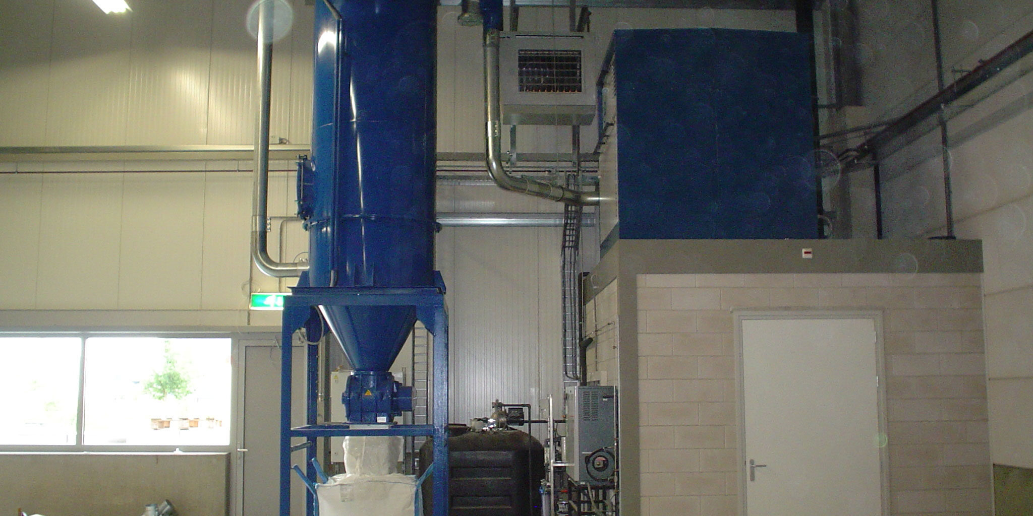 Centraal stofzuigsysteem textielfabriek, stofzuigleidingwerk met daaraan gekoppeld een perslucht gereinigd slangenfilter en een rootsblower 30 kW. Systeem geschikt voor het stofzuigen met 6 punten tegelijk