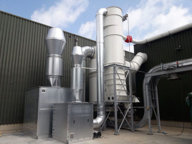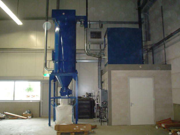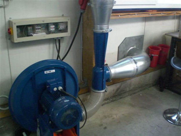Stofafzuiging aktiefkool fabrikant, 2 afzuigarmen gekoppeld aan een mechanisch gereinigde stofafscheider