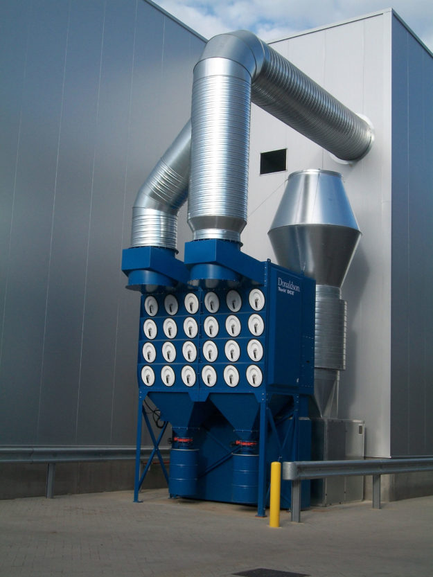 Centraal stofzuigsysteem textielfabriek, stofzuigleidingwerk met daaraan gekoppeld een perslucht gereinigd slangenfilter en een rootsblower 30 kW. Systeem geschikt voor het stofzuigen met 6 punten tegelijk
